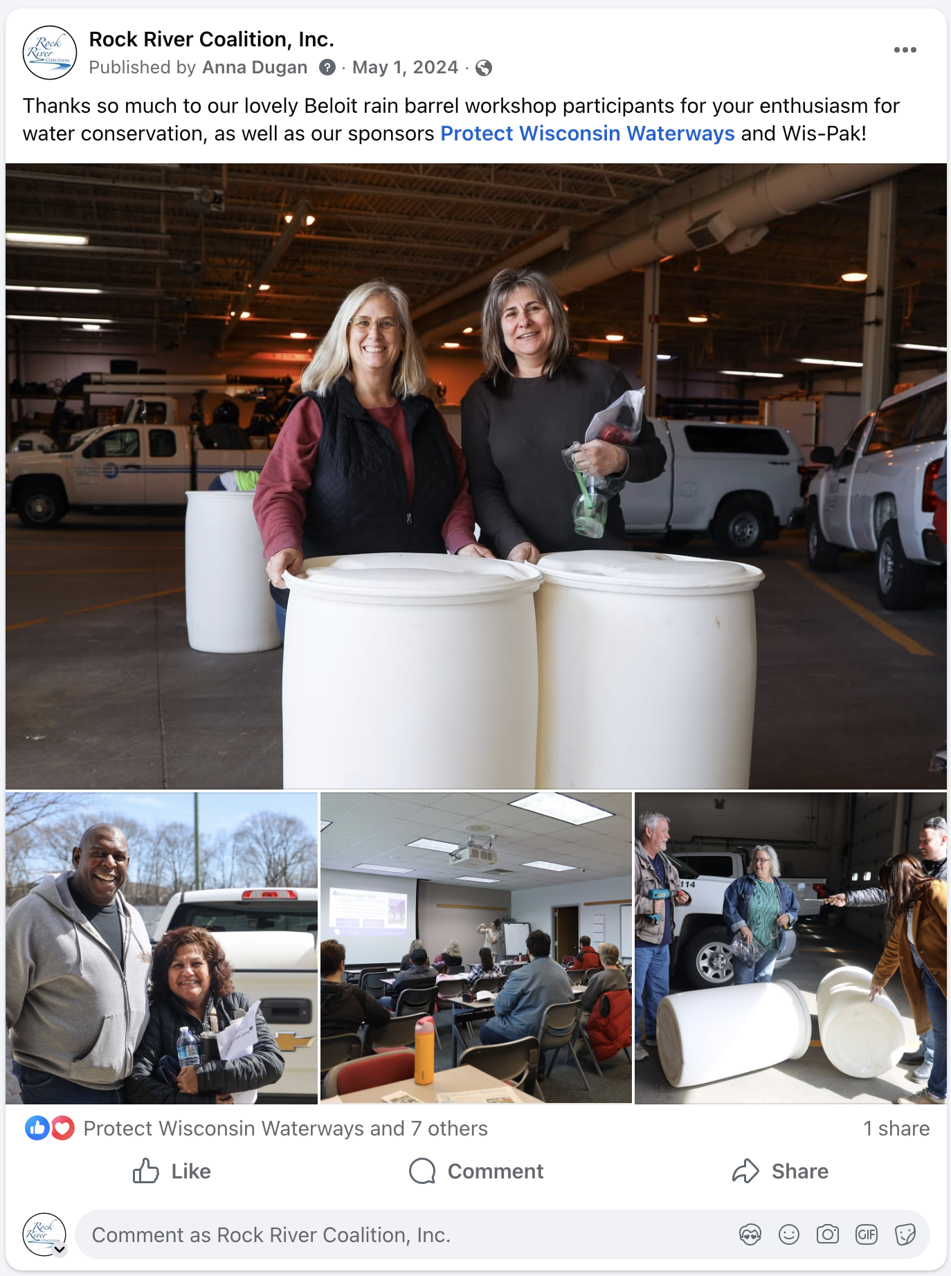 Rock River Coalition hosts rain barrel workshops for residents around the Rock River Basin, quipping individuals with the tools to protect their local water. Rain barrel workshops are in collaboration with The City of Watertown, River Network and Wis-Pak Inc. For more information visit the Rock River Coalition website.
